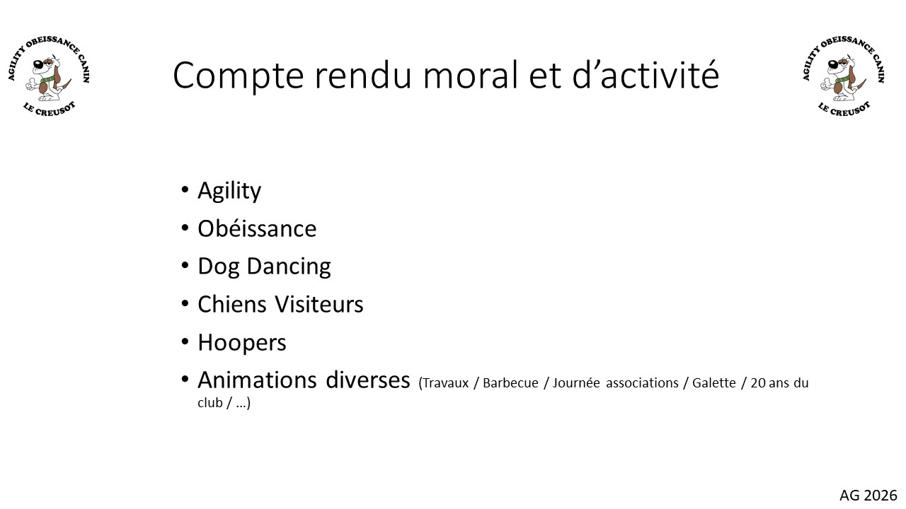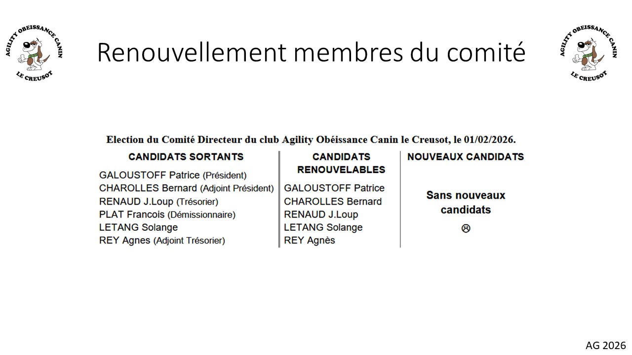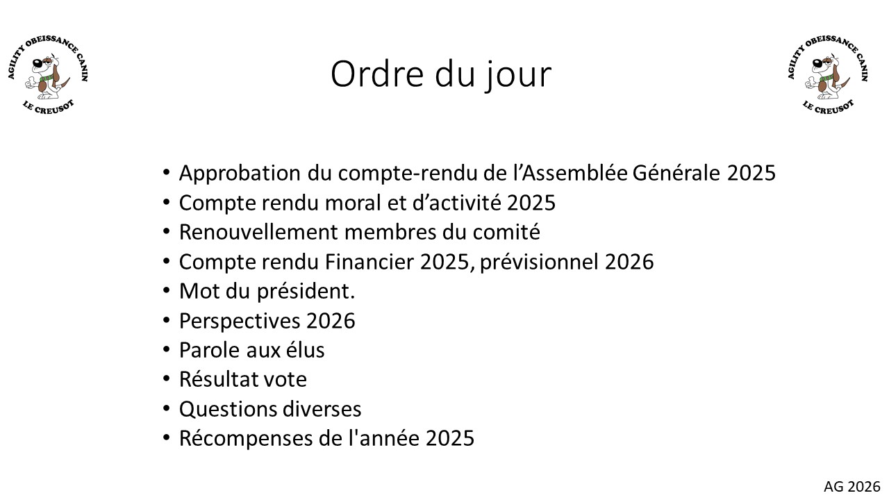 L’assemblée générale de l’Agility Obéissance Canin du Creusot s’est tenue dimanche 01 Février 2026 à la salle  Guynemer.