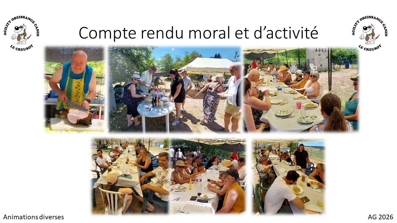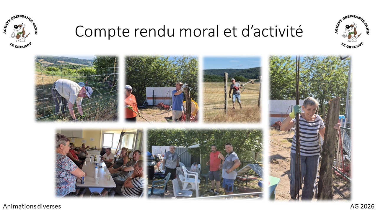 Les différents intervenants (président, secrétaire, trésorier, responsables de sections) ont montré tout le dynamisme du club.  Le président en a profité pour remercier la ville du Creusot pour le prêt des locaux et l’entretien des terrains. Il a signalé les travaux d’agrandissement du terrain d’Agility pour une mise aux normes et la mise en place d’un auvent devant le bureau.